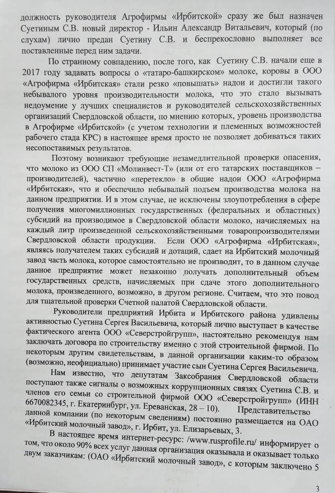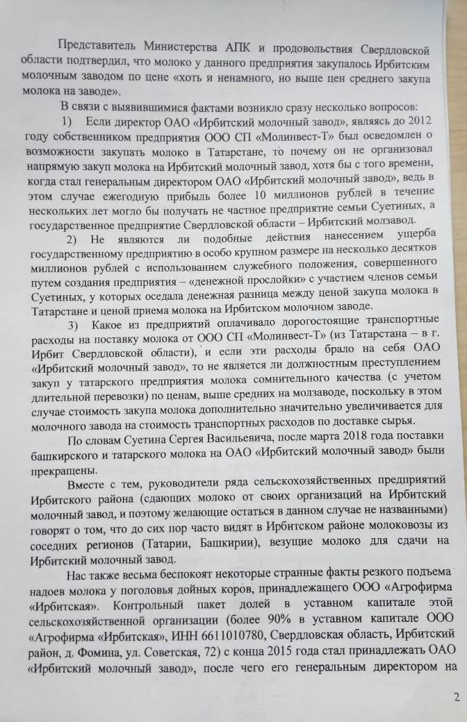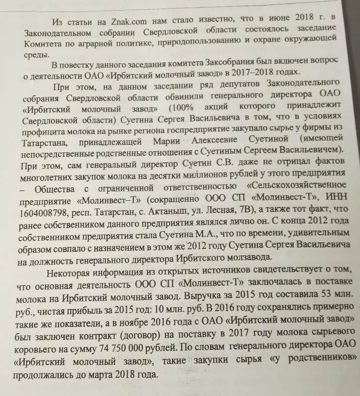 Читатели проекта «Компромат-Урал» надеются, что с нелёгкой руки господина Суетина займы из средств госпредприятия худо-бедно дойдут до тех, кто реально нуждается и болеет за качественное сырьё. Но есть большие сомнения, что будет именно так. От источников в депутатском корпусе в редакцию поступили материалы о финансовых манипуляциях АО «Ирбитский молочный завод». По их анализу сложно не прийти к мнению, что директорат слишком вольготно распоряжается госресурсами, с явным личным интересом…