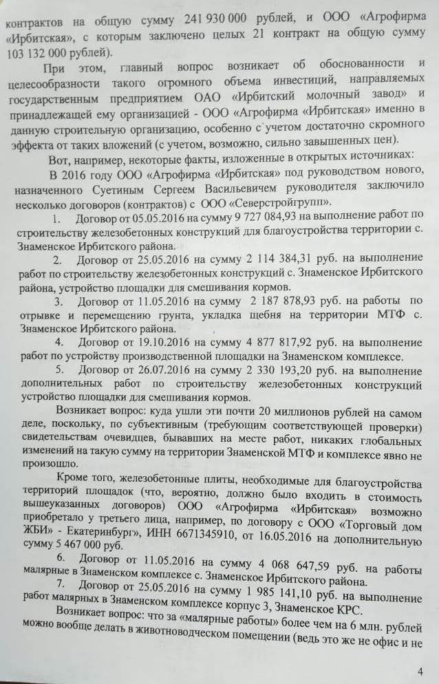 Интересна для читателей проекта «Компромат-Урал» и (как они полагают) сотрудников правоохранительных органов подоплёка денежных перечислений со счетов АО «Ирбитский молочный завод» и его дочки – ООО Агрофирма «Ирбитская» - на счета ООО «СеверСтройГрупп». Для этой фирмы, зарегистрированной в Екатеринбурге на улице Ереванская, 28-10, молзавод (с приходом Суетина) стал золотоносной жилой по части госконтрактов (их перечень с подробными реквизитами имеется в редакции «Компромат-Урал»). С 2013 года ООО «СеверСтройГрупп» контролирует Сергей Клюев, доля госконтрактов от других заказчиков в его портфеле мизерная. Согласно официальным сведениям, например, с 2015 по 2018 годы «СеверСтройГрупп» получила от молзавода – 249,28 млн. и ещё 103,13 млн. рублей от его дочерней агрофирмы.