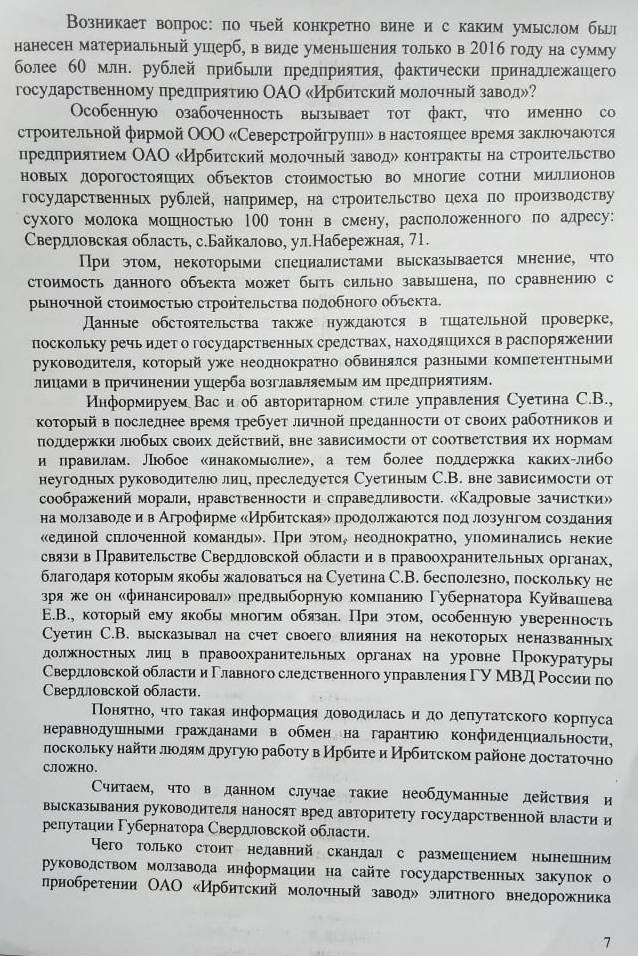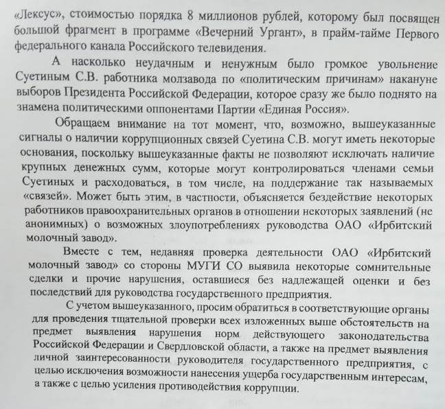 Профильного образования у Суетина нет, он – юрист. С пищепромом, как указано в официальной биографии, его связывает только опыт работы на молочном предприятии «Ураллат» в Берёзовском. И в тот же период прозвучали публичные доводы о том, что Суетин не чист на руку.