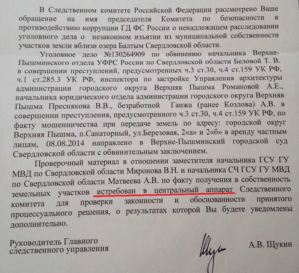 Однако ни главу Верхней Пышмы, ни его заместителя Корякина, ни высокопоставленных полицейских в качестве обвиняемых по уголовному делу о махинациях с землей не привлекли. Следователи нашли состав преступления только в действиях сотрудников, регистрирующих земельные участки.
